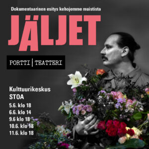 JÄLJET on Porttiteatterin dokumentaarinen teos rikostaustaisten esiintyjän temppuilevista, kovia kokeneista ja reissussa rähjääntyneistä ruumiista. Se on esitys tykyttävistä sydämistä, arvista ja vammoista, mutta myös voimasta, nautinnosta ja hoivasta. Kuinka uskaltaa nojata toiseen? Kuinka kaatua ja nousta uudelleen? Esitys on matka. Se on silmänisku myyttisille sankareille, kotiinpalaajille.